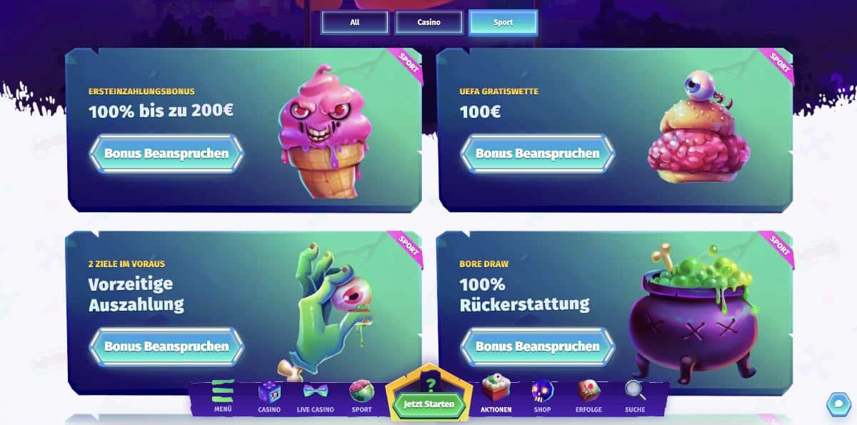 Cashalot bietet einen Einzahlungsbonus von 100% bis zu 100€ mit Umsatzbedingungen von 10x, was ideal ist, um das Sportwetten Angebot auf dieser Plattform auszuprobieren.